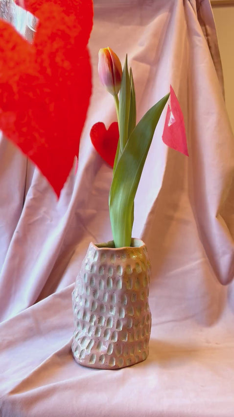 Eläväinen pilkullinen savi ja roosa lasitus.