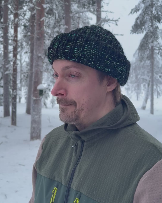 Malli on joustunneuletta joka istuu päähän kuin päähän. Sen saa puettua joko rennosti lempeämmällä kelillä tai paukkupakkasille myös peittämään nenän, hengittäminen muhkean villaneuleen läpi on silti helppoa. Lisäksi voit taitella lakin pipoksi! Näin naamaaukko asettuu luontevasti taitteeseen.